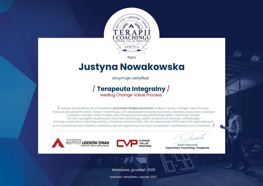 Pracuję jako terapeuta integralny, łącząc hipnoterapię podejściem ukierunkowanym na realną zmianę wewnętrznych schematów, regulację układu nerwowego oraz odbudowę sprawczości i stabilności wewnętrznej.